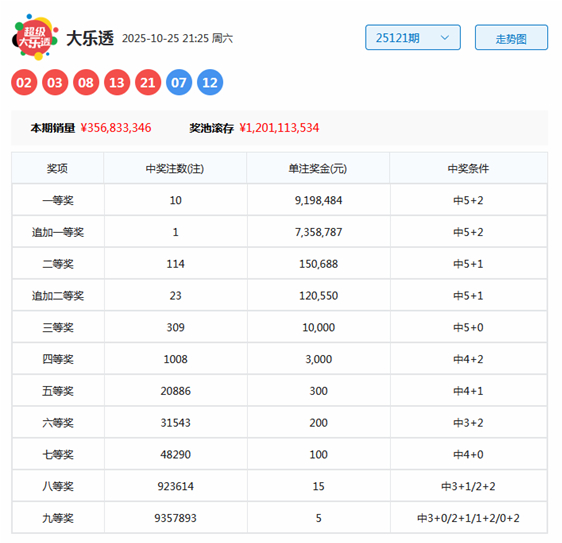 上期开奖:体彩大乐透第2025121期开奖号码为:02 03 08 13 21 + 07 12欧洲买球体育信息。