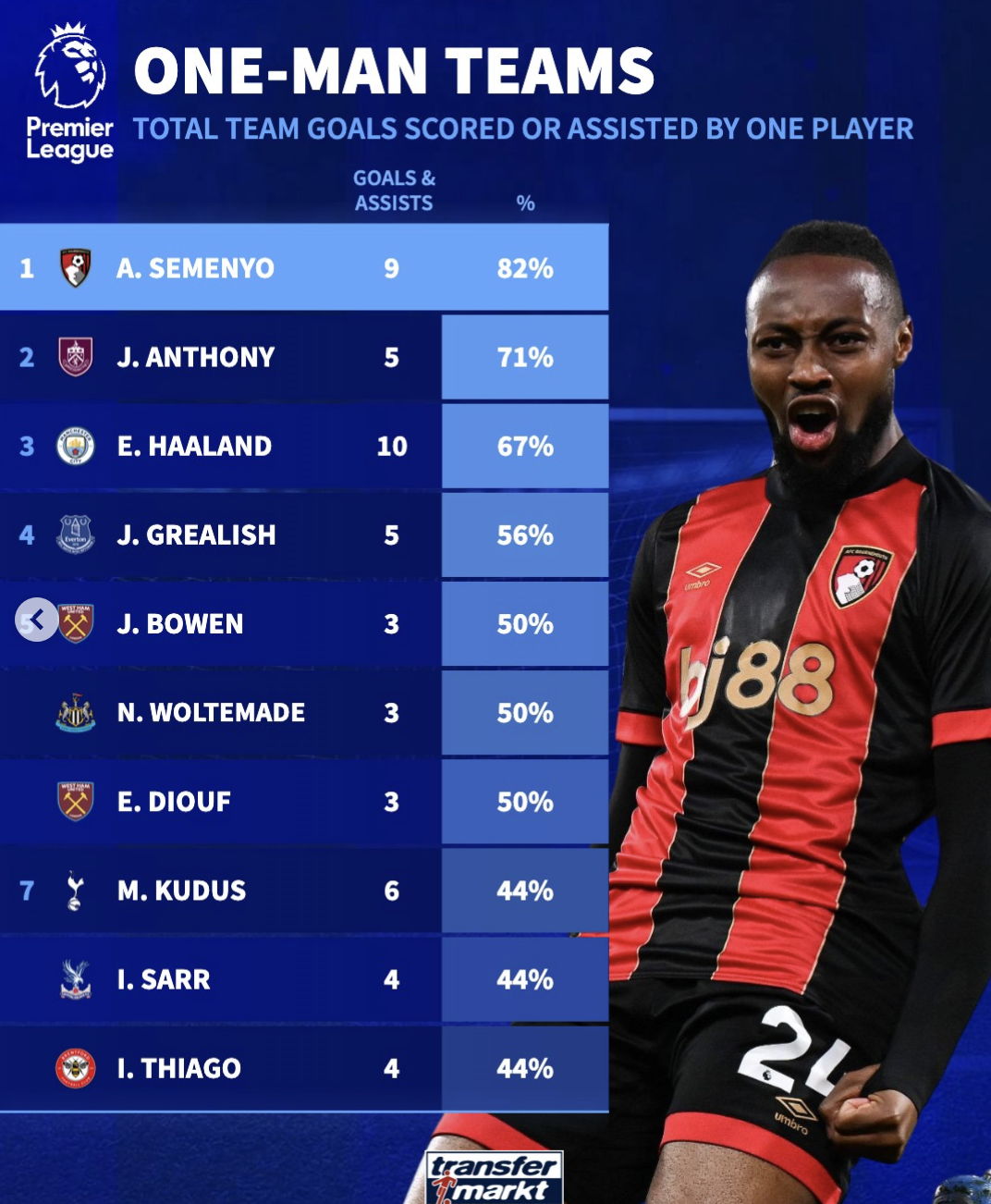 伯恩茅斯的塞梅约径直参与9球,占球队总进球数的82%高居榜首。伯恩利的安东尼和曼城的哈兰德参与了5球(占比71%)和10球(占比67%)位列二三。